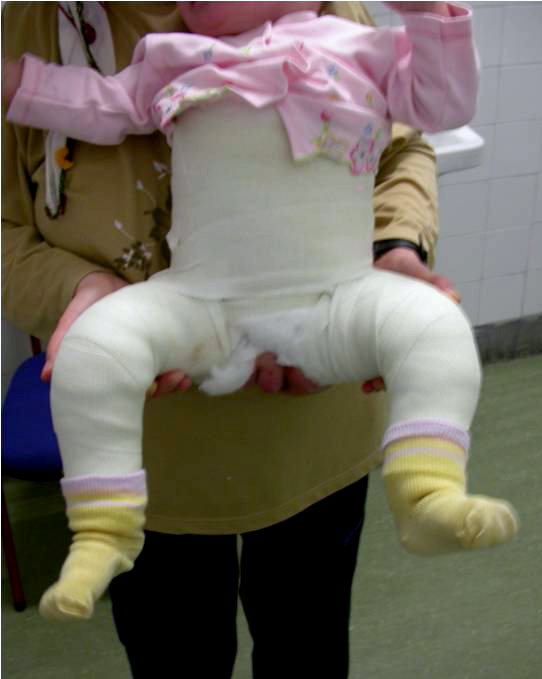 İster basit bir gelişim geriliğinden ibaret, ister kalça çıkığı olsun dışardan takılan ve aile tarafından kullanılan basit cihaz yöntemlerinin başarısız olması halinde ameliyathanede uygulanan yöntemler gereklidir. Bu yöntemler genellikle, 1-kalçanın yuvasına tam olarak oturup oturmadığını belirlemek amacıyla içine boya (kontrast madde) verilerek yapılan artrografiyi, 2-kalçayı yuvasına yerleştirmeye yönelik cerrahi işlemleri ve 3-gövde alçısı uygulanmasını içerir. İlk iki işlemin uygulanma şekli veya gerekliliği değişiklik gösterebilir ancak değişmeyen kısım alçılamadır.
